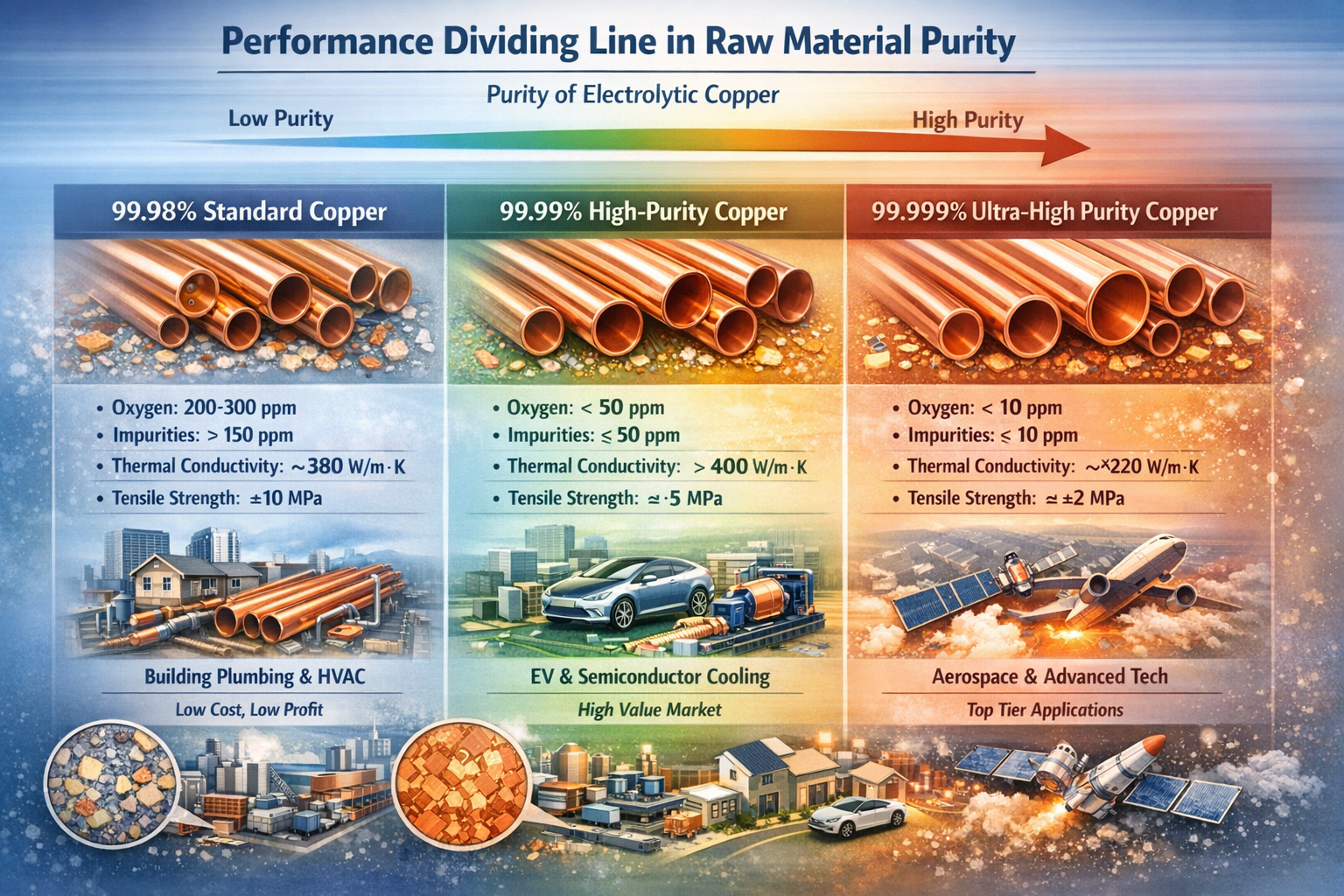 Table 1: Comparison of Core Parameters and Application Value of Copper Tube Raw Materials with Different Purity Levels