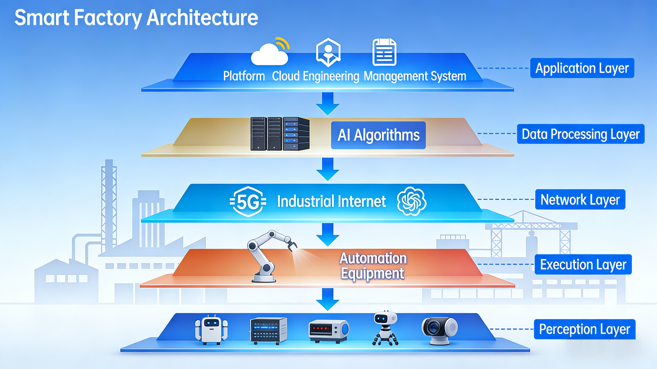Figure: Smart factory architecture typically includes perception, network, data processing, execution, and application layers, enabling data flow from sensors to cloud platforms.