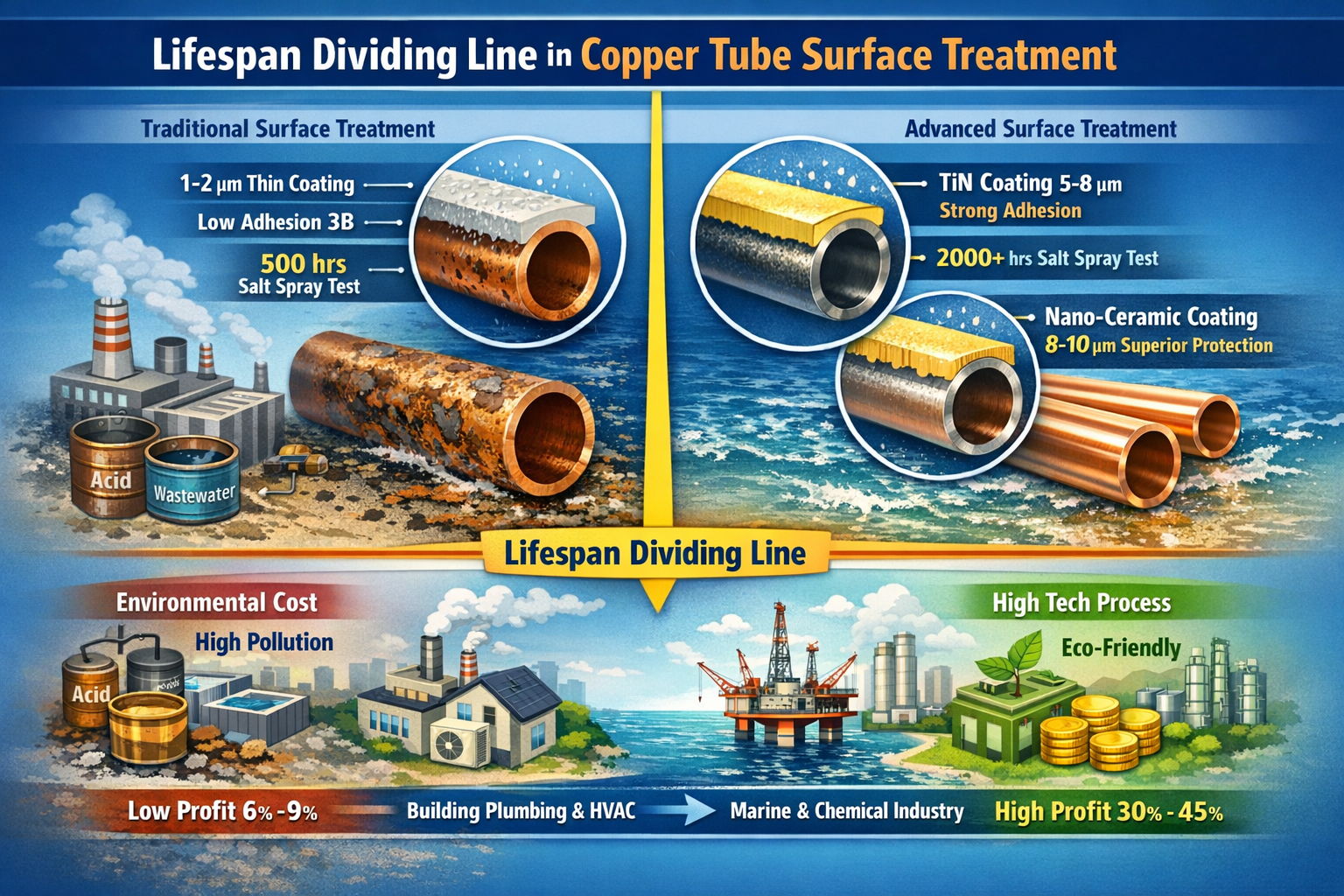 “Both are copper tubes used in seawater desalination equipment, but the products we treated with conventional pickling and passivation showed pitting corrosion and leakage in less than 3 years in the marine environment; while the competitor's product, treated with vacuum ion plating technology, has a service life of over 15 years, and its unit price is 30% higher than ours.” Mr. Liu, the technical director of a copper alloy tube company in Qingdao, held up two sections of discarded and intact copper tubes, revealing the hidden value of surface treatment technology. Surface treatment, as the final step in copper tube production, may seem like a simple auxiliary operation of "rust removal and coating," but it directly determines the product's corrosion resistance, wear resistance, and service life, and further impacts its market positioning and added value. Currently, most domestic copper tube manufacturers still rely on traditional surface treatment processes such as pickling and ordinary passivation, making their products unsuitable for demanding environments such as marine, chemical, and high-end water treatment; a few companies, however, have upgraded their refined surface treatment technologies, allowing their copper tubes to maintain stable performance in extreme environments and easily capture the high-end market. This thin "protective film" is becoming a core detail that differentiates the competitiveness of copper tube products, and it also holds the key to the industry's upgrade from "qualified" to "high-quality."