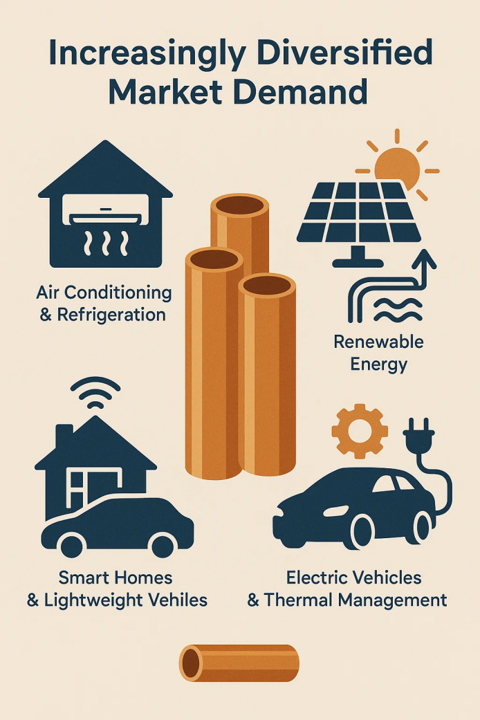 With the accelerated development of smart homes, lightweight vehicles, and electrification, the application scenarios of copper tubes are also expanding. High-performance copper tubes are not only core components for condensers and evaporators in home appliances, but also play a crucial role in the thermal management systems of new energy vehicles. This market is expected to continue to grow.
