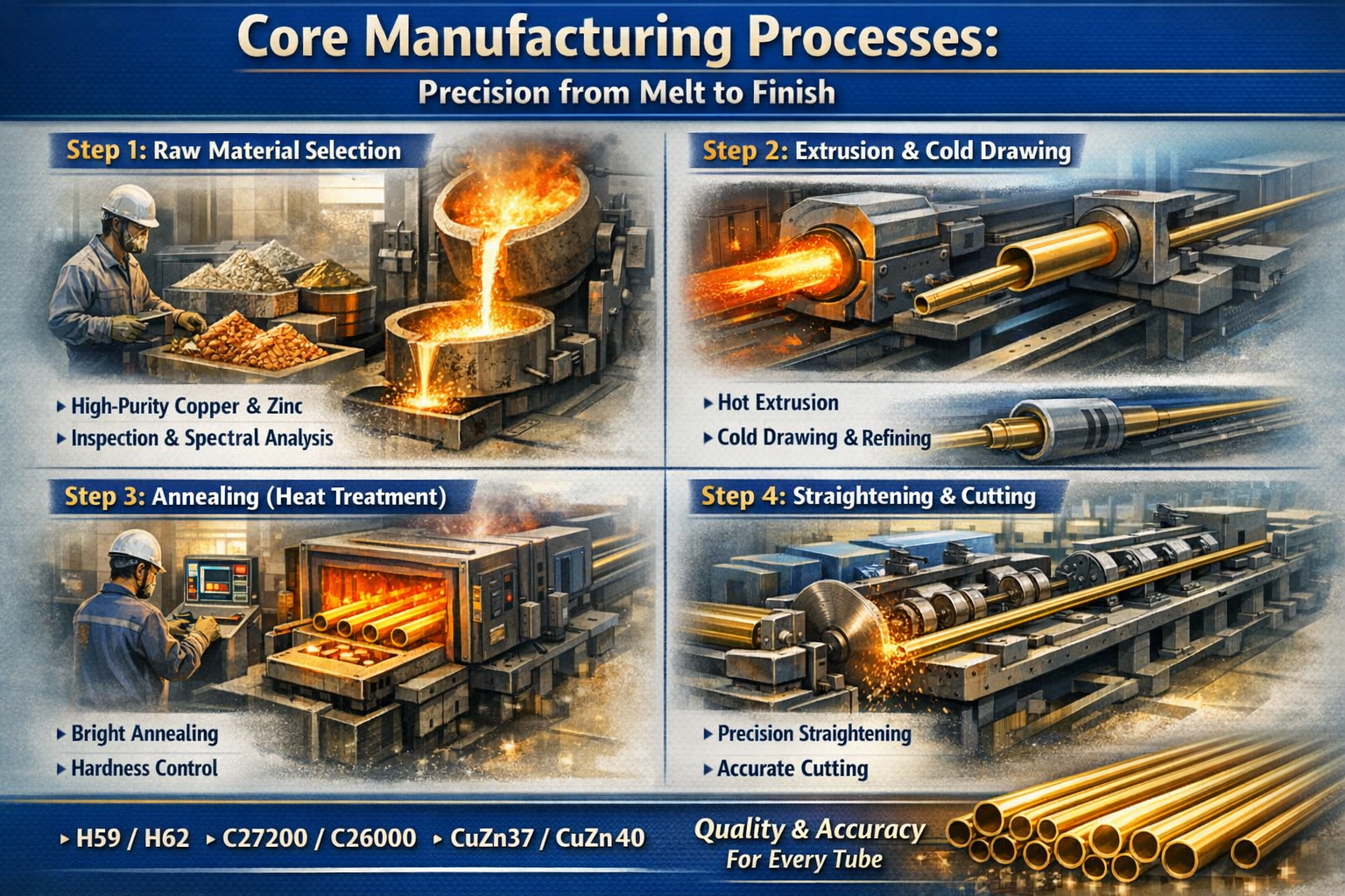 Transparency is the foundation of trust in B2B partnerships. A professional brass tube factory doesn't just "make" tubes; it follows a rigorous, scientifically-controlled sequence to ensure every millimeter of the product meets international standards.