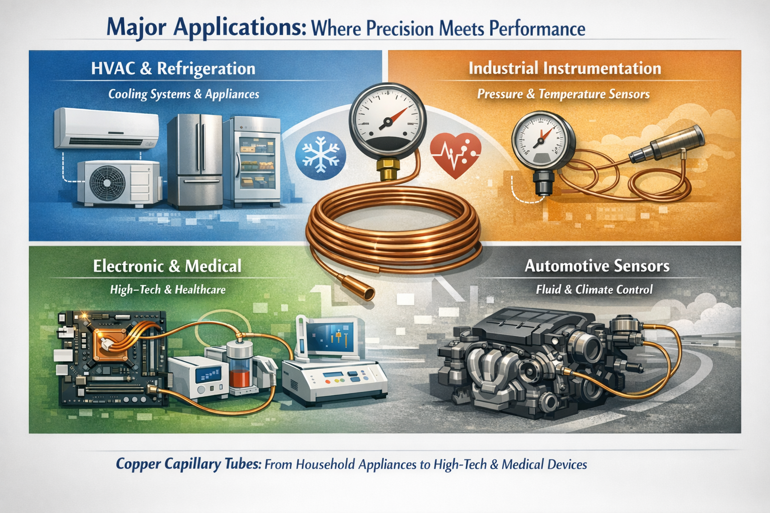 The most common use for copper capillary tubing is in the HVAC (Heating, Ventilation, and Air Conditioning) industry. It acts as the primary metering device in small-to-medium scale cooling systems.