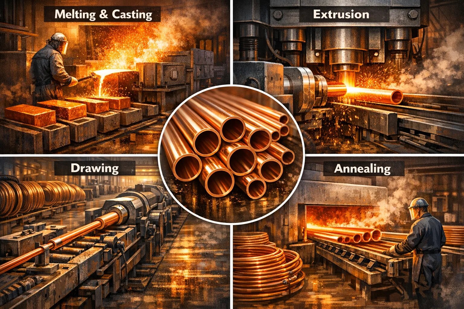 Walking into a copper tube factory feels like entering a world of fire and precision. The process of turning a heavy block of metal into a thin, hollow tube is a feat of engineering. Let’s break it down into four simple steps: