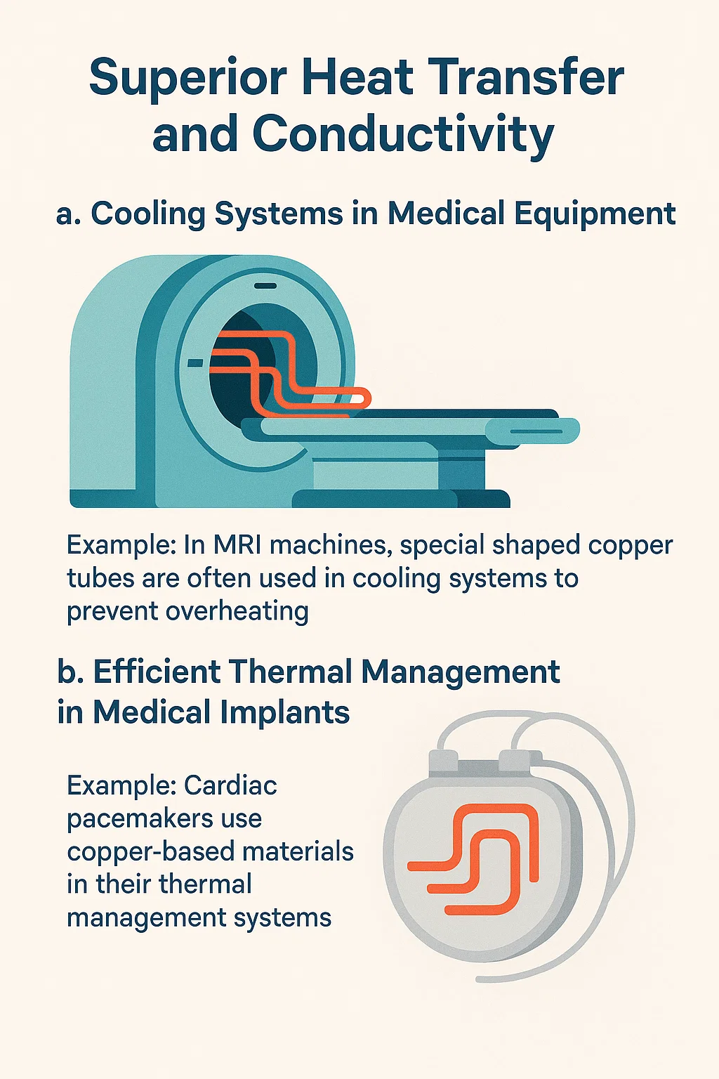 Many medical devices, such as MRI machines, CT scanners, and surgical lasers, generate significant amounts of heat during operation. Copper tubes, especially those with specialized shapes, are used to dissipate heat efficiently, ensuring that the devices remain cool and operational for long periods.